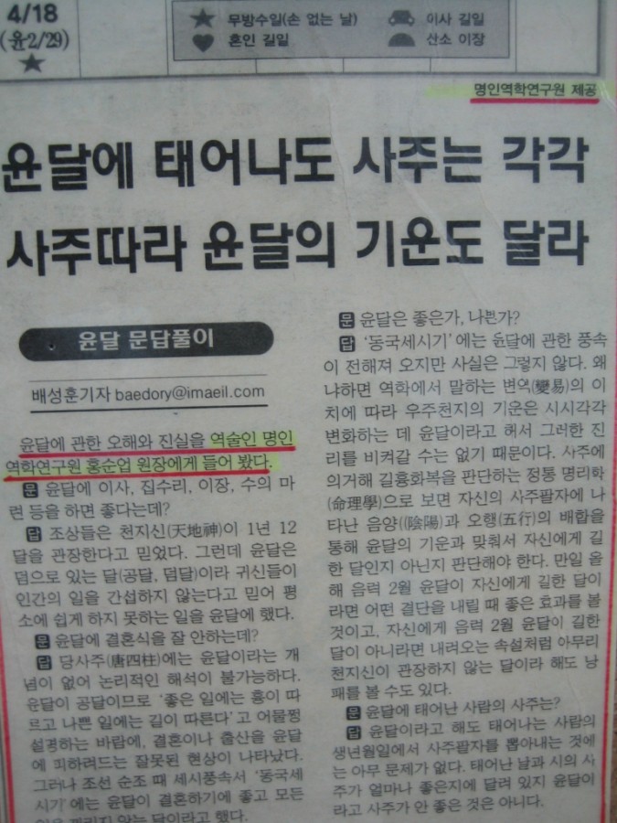 윤달과 사주 (대구매일신문 2004. 3.18자) 페이지 정보 작성자 관리자 댓글 0건 조회 4,961회 작성일 10-07-20 17:58 목록 본문 ㅇ 윤달과 사주 (대구매일신문 2004. 3.18자) 이전글설 명절고민 어떻게,장묘문화 (대구매일신문 2007.2.17자) 10.07.20 다음글속 궁합봐야 하나 말아야 하나 (대구매일신문 2003.9.18자) 10.07.20 댓글 0 댓글목록 등록된 댓글이 없습니다.